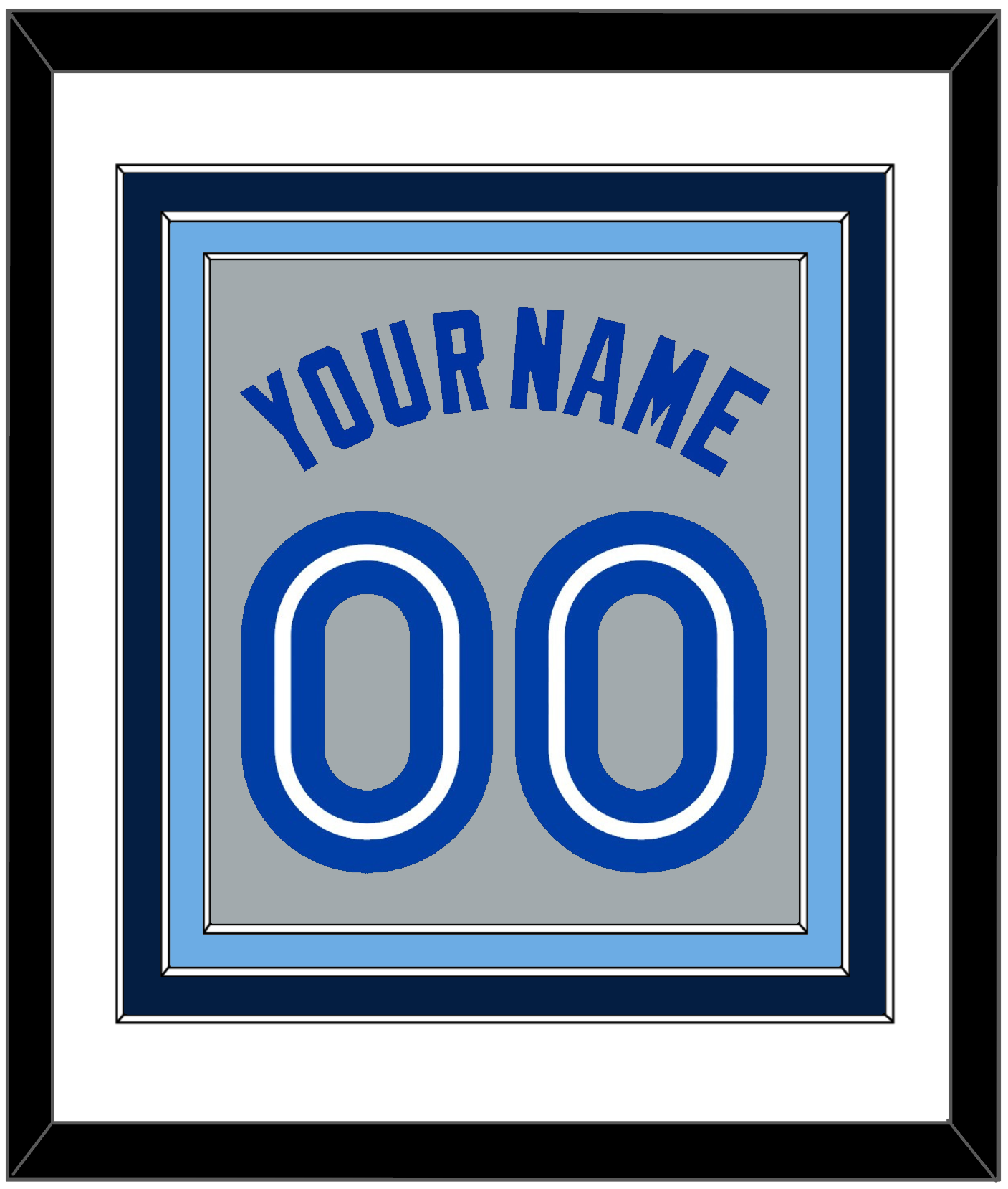Toronto Road Gray Jersey (1989 Through 1996) Name & Number. Triple Mat: White Mat Over A Navy Blue Mat Over A Light Blue Mat. Blue Name And Number Mounted On A Gray Mat. Black Frame.