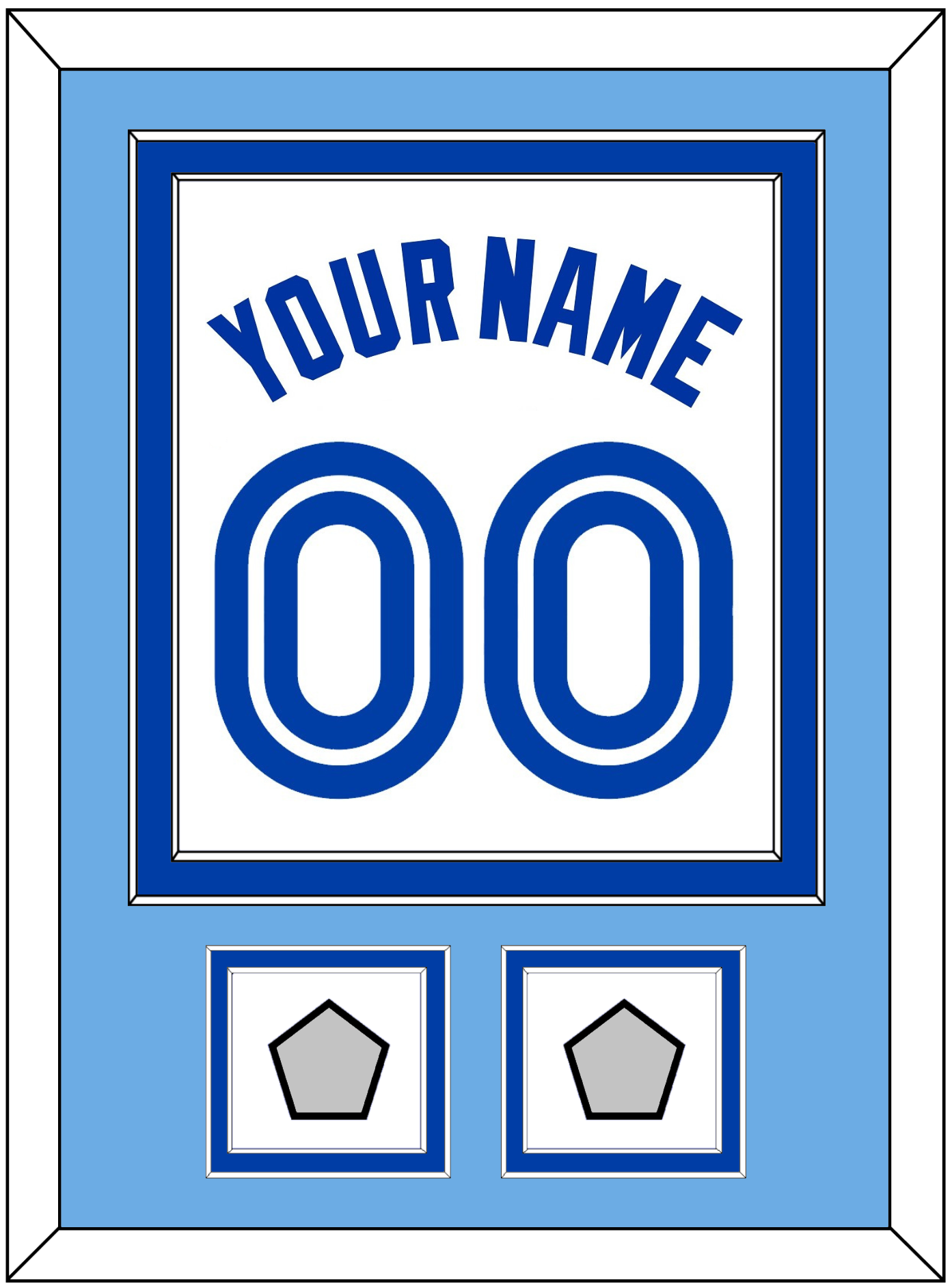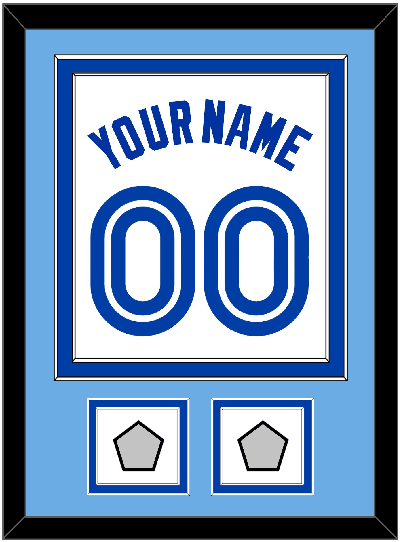 Toronto Home White Jersey (1981 Through 1996) Name & Number With 1992 & 1993 World Series Patches.   Double Mat:  Light Blue Mat Over A Blue Mat.  Blue Name, Number & Patches Mounted On A White Mat.  White Or Black Frame.