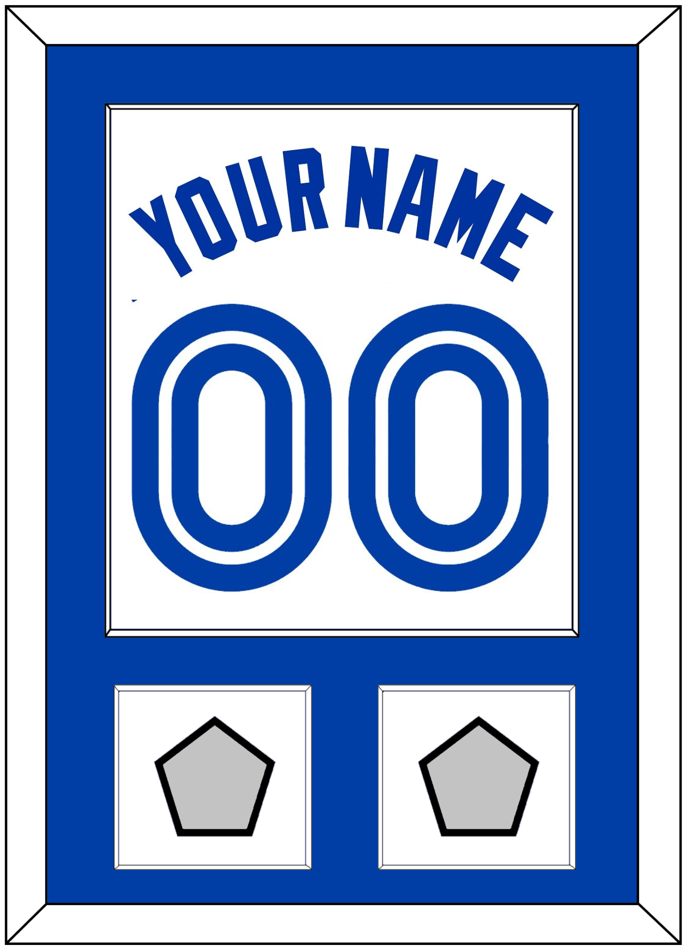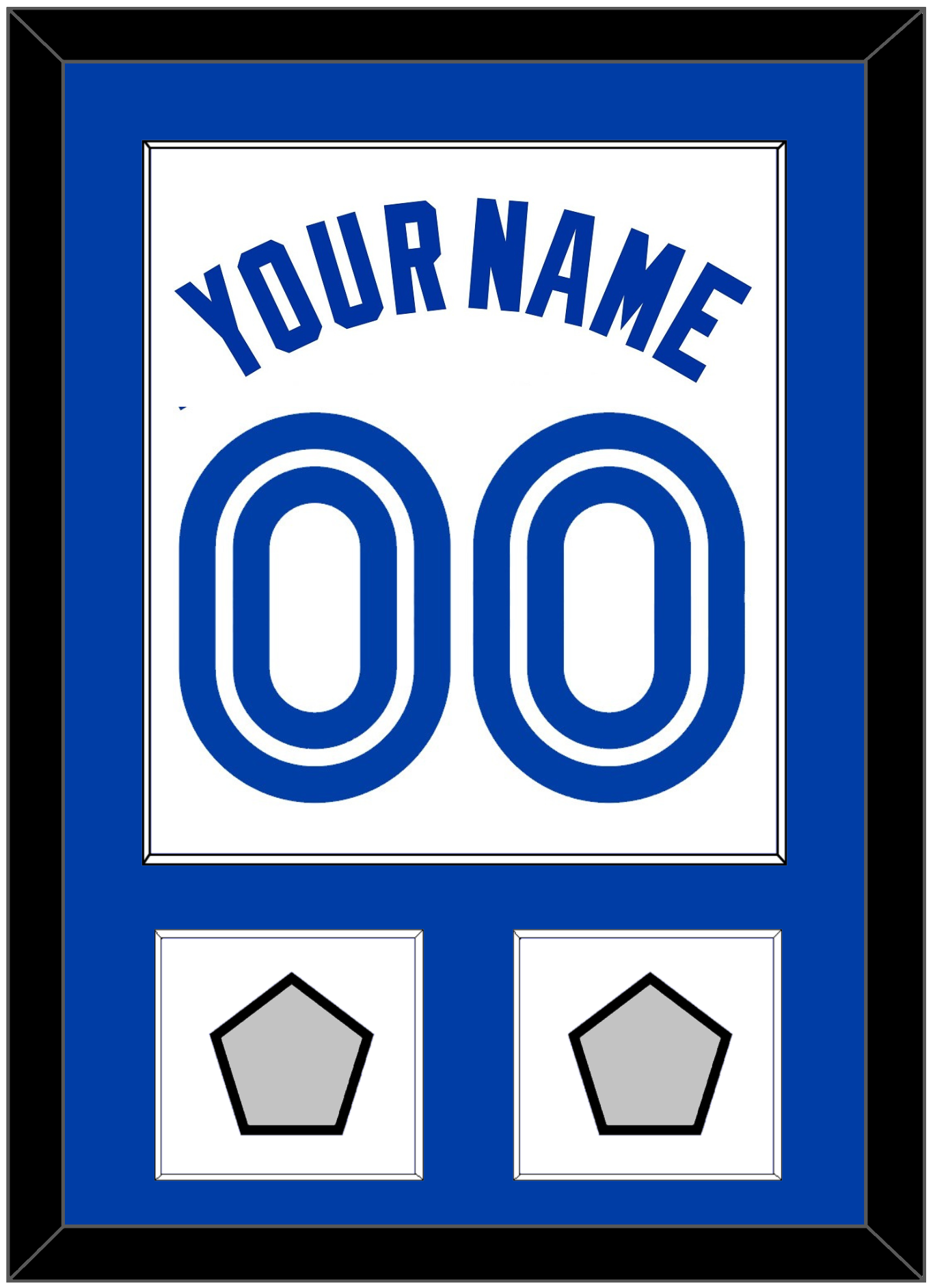 Toronto Home White Jersey (1981 Through 1996) Name & Number With 1992 & 1993 World Series Patches.   Single Mat:  Blue Mat With Blue Name, Number & Patches Mounted On White Mat.  White Or Black Frame.