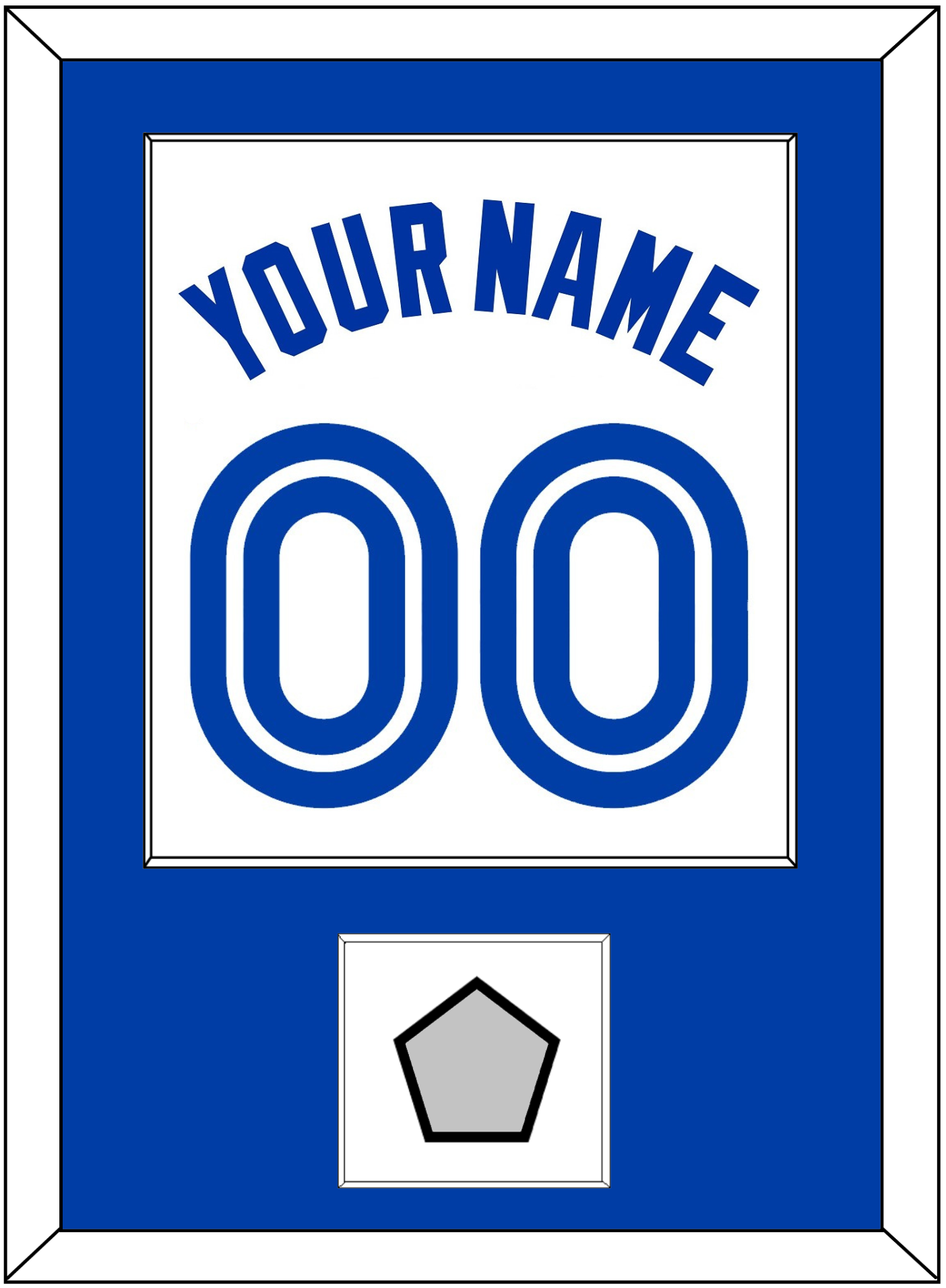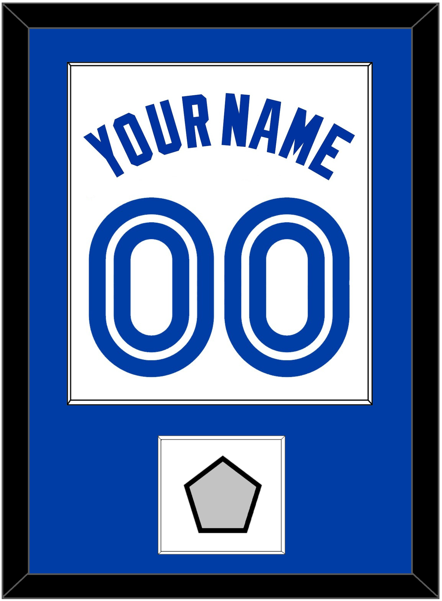 Toronto Home White Jersey (1981 Through 1996) Name & Number With 1992 Or 1993 World Series Patch.   Single Mat:  Blue Mat With Blue Name, Number & Patch Mounted On White Mat.  White Or Black Frame.