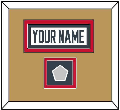 Vegas Road White Jersey Nameplate With A 2023 Stanley Cup Finals Patch. Double Mat Cut: Gold Mat Over A Red Mat. White Nameplate And Patch Mounted On A Steel Gray Mat. Black Or White Frame.
