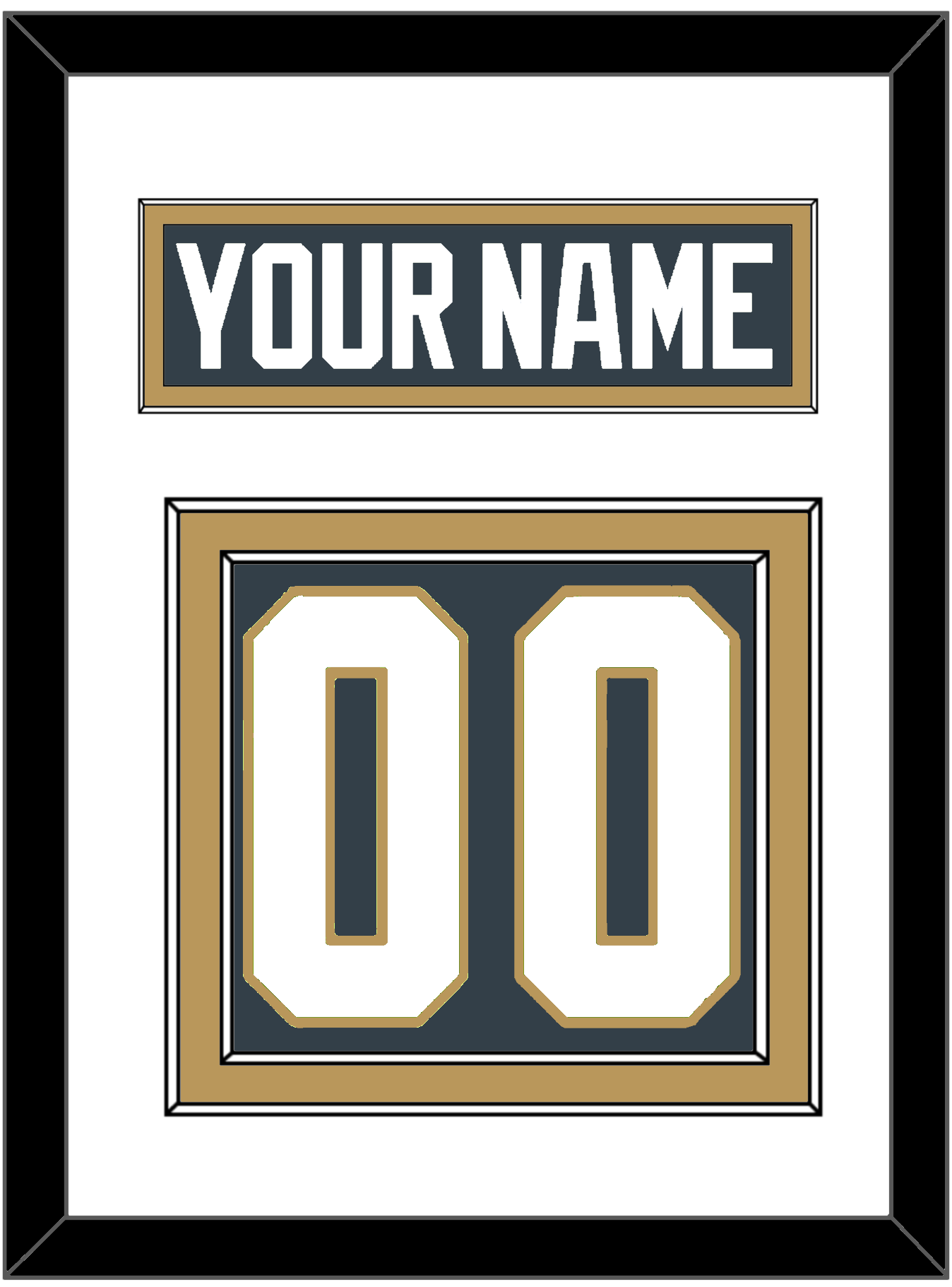 Vegas Home Steel Gray Jersey Nameplate & Numbers (From The Back Of The Jersey). Nameplate Is Single Mat Cut: White Mat With Steel Gray Nameplate Mounted On A Gold Mat. To Match The Jersey, Number Is Double Mat Cut: White Mat Over A Gold Mat, White Number Mounted On A Steel Gray Mat. Black Frame.