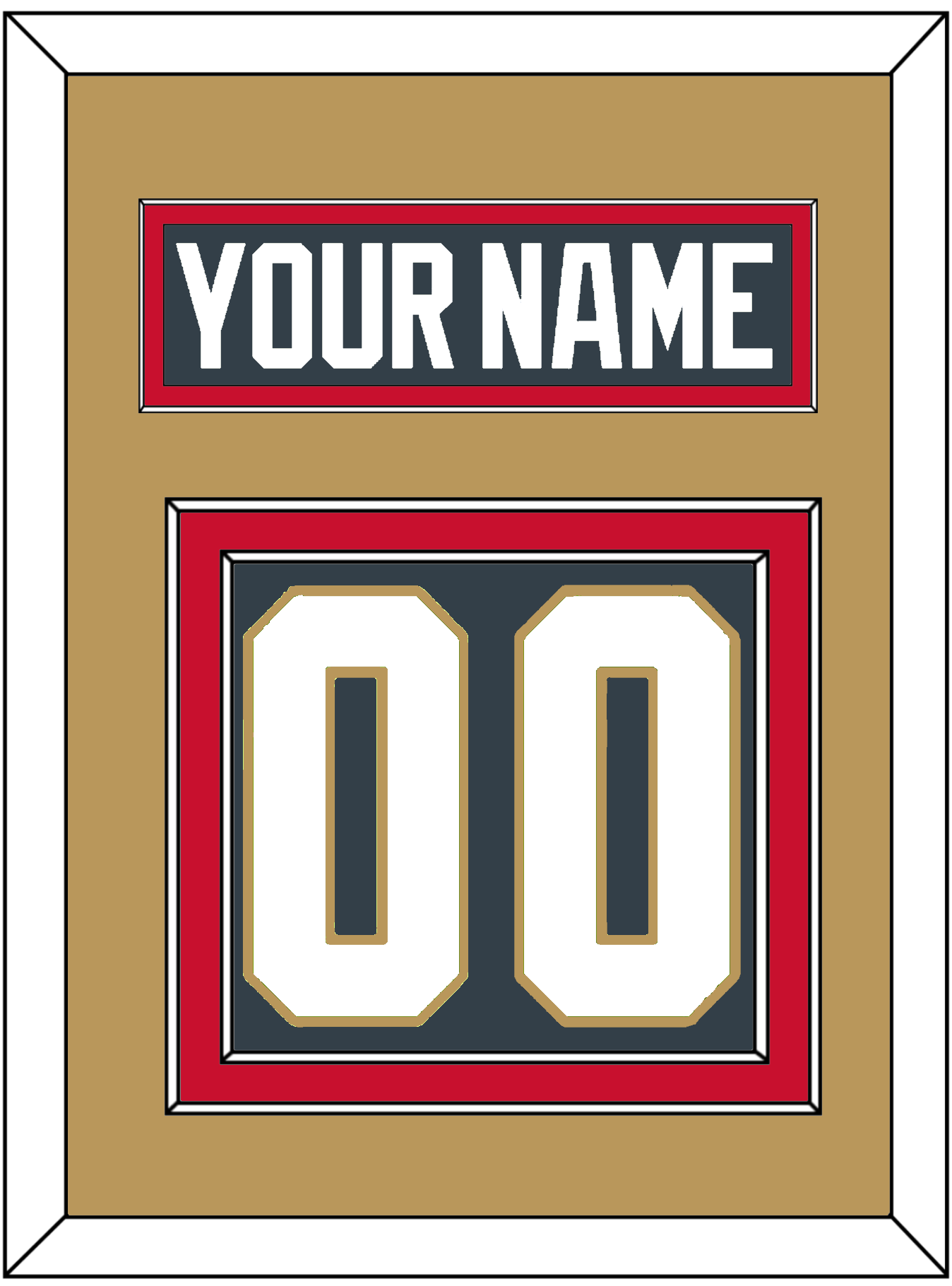 Vegas Home Steel Gray Jersey Nameplate & Numbers (From The Back Of The Jersey).  Nameplate Is Single Mat Cut:  Gold Mat With Steel Gray Nameplate Mounted On A Red Mat.  To Match The Jersey, Number Is Double Mat Cut:  Gold Mat Over A Red Mat, White Number Mounted On A Steel Gray Mat.  Black Or White Frame.