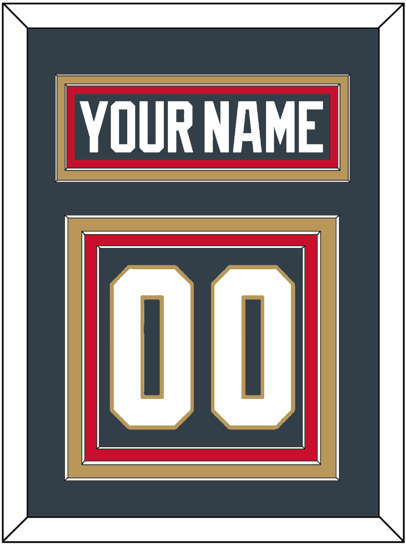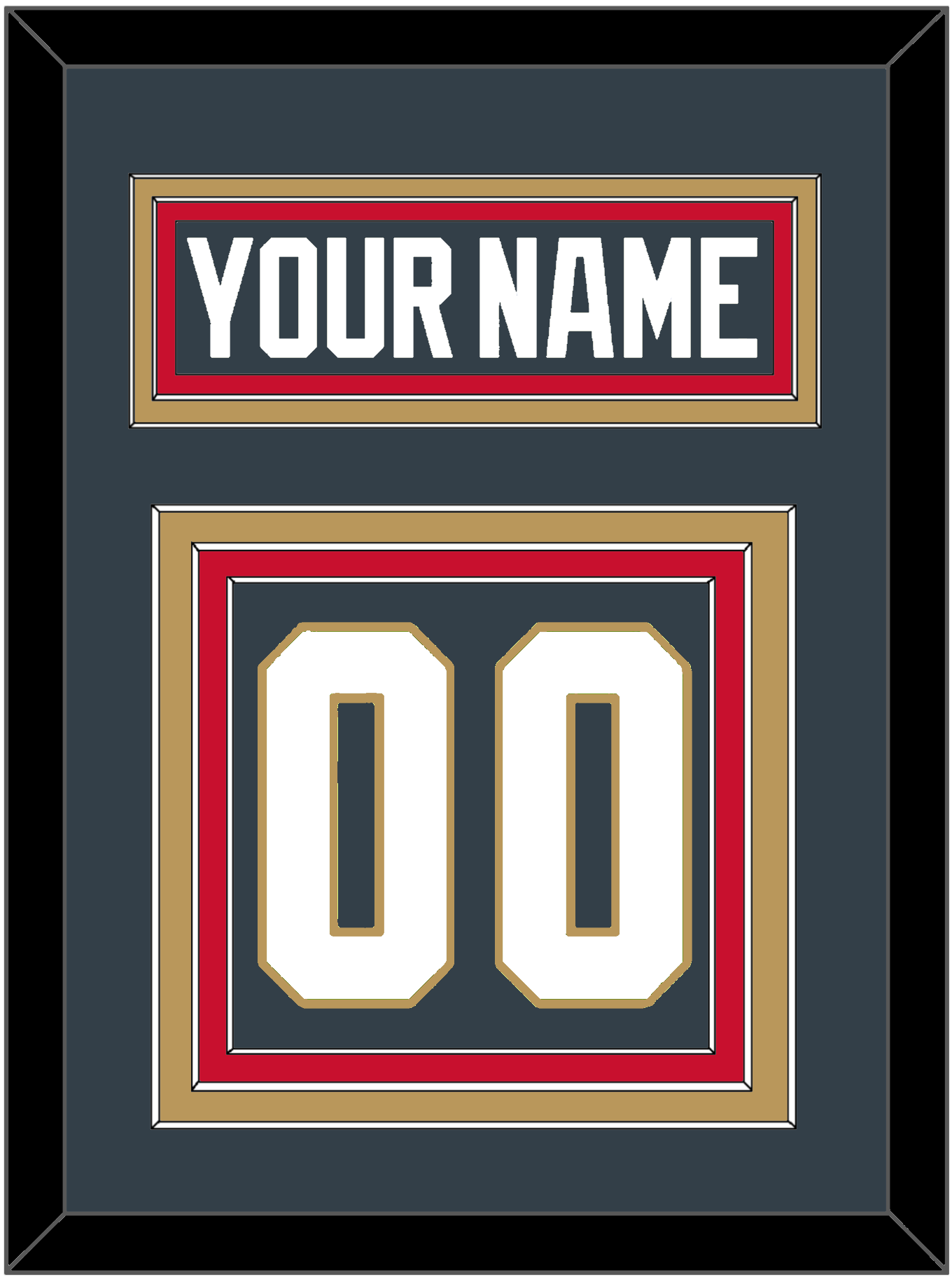 Vegas Home Steel Gray Jersey Nameplate & Numbers (From The Back Of The Jersey). Nameplate Is Double Mat Cut: Steel Gray Mat Over A Gold Mat. Steel Gray Nameplate Mounted On A Red Mat. To Match The Jersey, Number Is Triple Mat Cut: Steel Gray Mat Over A Gold Mat Over A Red Mat, White Number Mounted On A Steel Gray Mat. White Or Black Frame.