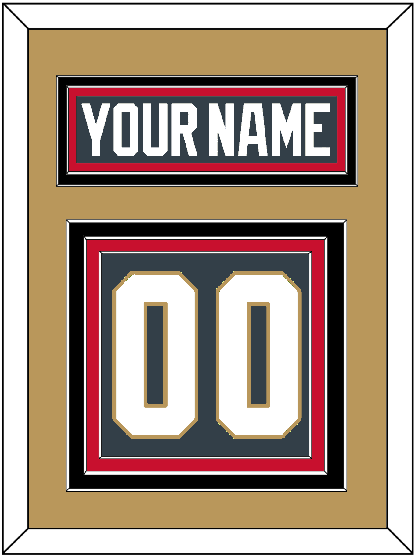 Vegas Home Steel Gray Jersey Nameplate & Numbers (From The Back Of The Jersey). Nameplate Is Double Mat Cut: Gold Mat Over A Black Mat. Steel Gray Nameplate Mounted On A Red Mat. To Match The Jersey, Number Is Triple Mat Cut: Gold Mat Over A Black Mat Over A Red Mat, White Number Mounted On A Steel Gray Mat. Black Or White Frame.