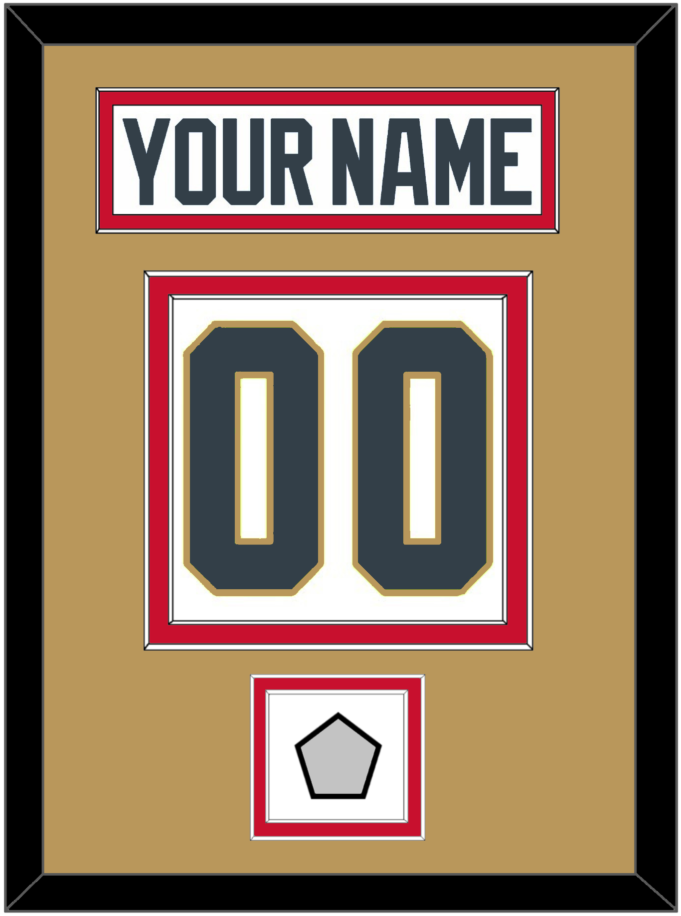 Vegas Road White Jersey Nameplate & Numbers (From The Back Of The Jersey) With 2023 Stanley Cup Champions Patch. Nameplate Is Single Mat Cut: Gold Mat With White Nameplate Mounted On A Red Mat. To Match The Jersey, Number Is Double Mat Cut: Gold Mat Over A Red Mat, Steel Gray Number & Patch Mounted On A White Mat. Black Or White Frame.