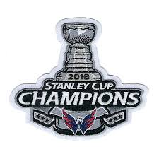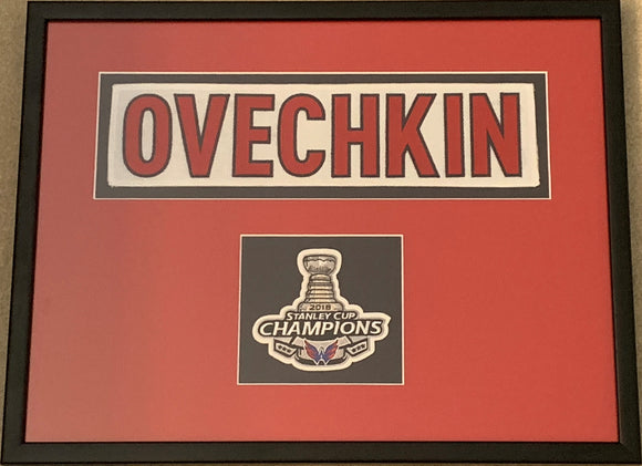Washington Road White Jersey Nameplate With 2018 Stanley Cup Champions Patch. Single Mat Cut: Red Mat With Nameplate & Patch White Nameplate Mounted On A Blue Mat. Black Or White Frame.