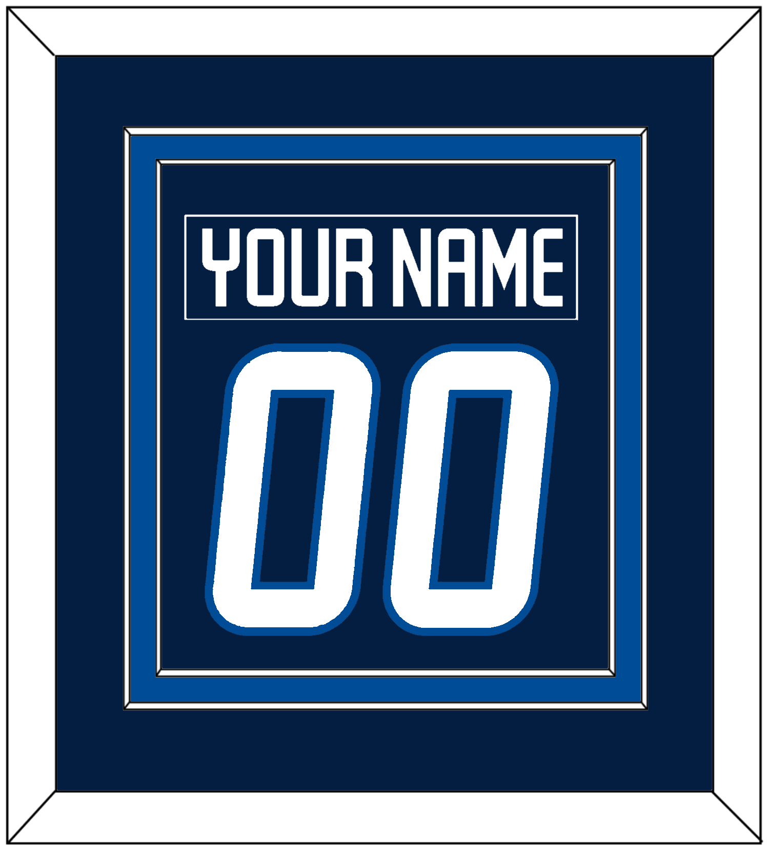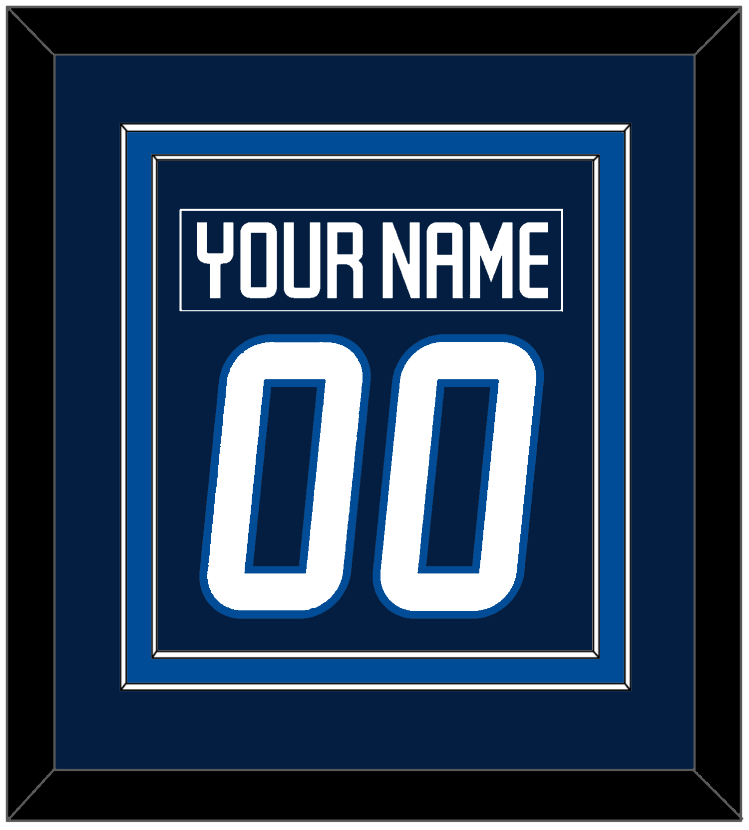 Winnipeg Home Navy Blue Jersey Nameplate & Number (From The Back Of The Jersey). Double Mat Cut: Navy Blue Mat Over A Blue Mat. Navy Blue Nameplate And White Number Mounted On A Navy Blue Mat. White, Black Or Silver (Metal) Frame.